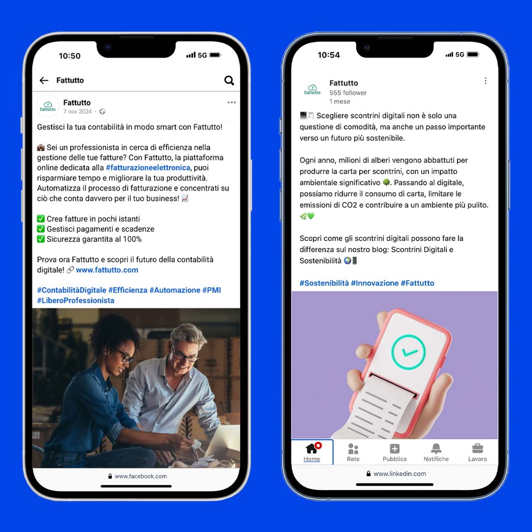 Per Fattutto gestiamo i profili social su Facebook e LinkedIn, con l’obiettivo di aumentare la brand awareness, grazie a contenuti di valore e di alto livello.